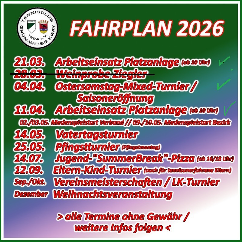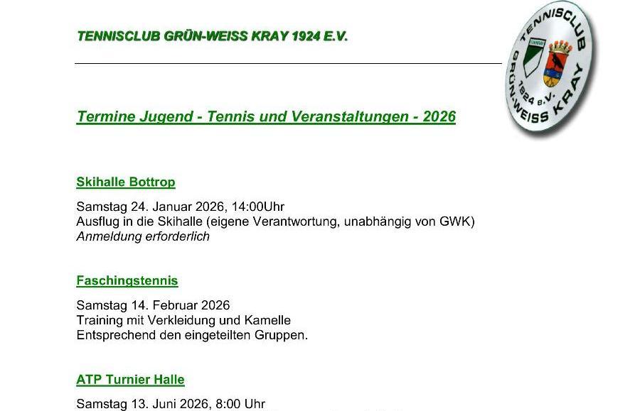 Geburtstagsfeier in Generationengemeinschaft – 100 Jahre TC Grün-Weiß Kray 1924Man könnte es auch „Treffen der Generationen“ nennen, hätte nicht die populäre „Star Trek“-Kinofilmreihe diesen Titel bereits vor dreißig Jahren für sich verbucht. Dennoch passt beim TC Grün-Weiß Kray 1924 das Drehbuch, denn besser hätte es nicht geschrieben werden können – pünktlich zur 100 Jahrfeier ist der Hochsommer zurück und lockt zum Jubiläum alle Generationen gemeinschaftlich auf die prächtig geschmückte Platzanlage am Volksgarten: Mitglieder, Gäste und Nachbarn erleben ein voll gepacktes Programm, bei dem es nicht nur gemeinschaftlich feiernd, sondern auch sportlich zur Sache geht. |