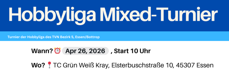 - großartige Pfingstmontagnutzung: 28 Teilnehmende, gut sechs Stunden Mixed-Doppel-Tennis und eine Menge neuer Spielerfahrungen, nicht nur für Einsteigende. Vielen Dank allen Beteiligten. Glück Auf! |