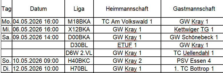 FINALE: Letztes Gruppenspiel der GWKDamen in der WHRBezirk5 im TennisZentrumEssen an der Hafenstraße. Bei einem Sieg gegen die Tabellenersten vom TV Eintracht-Frohnhausen winken Gruppensieg und Aufstieg. Am besten vor Ort anfeuern und Daumen drücken! Glück Auf! |